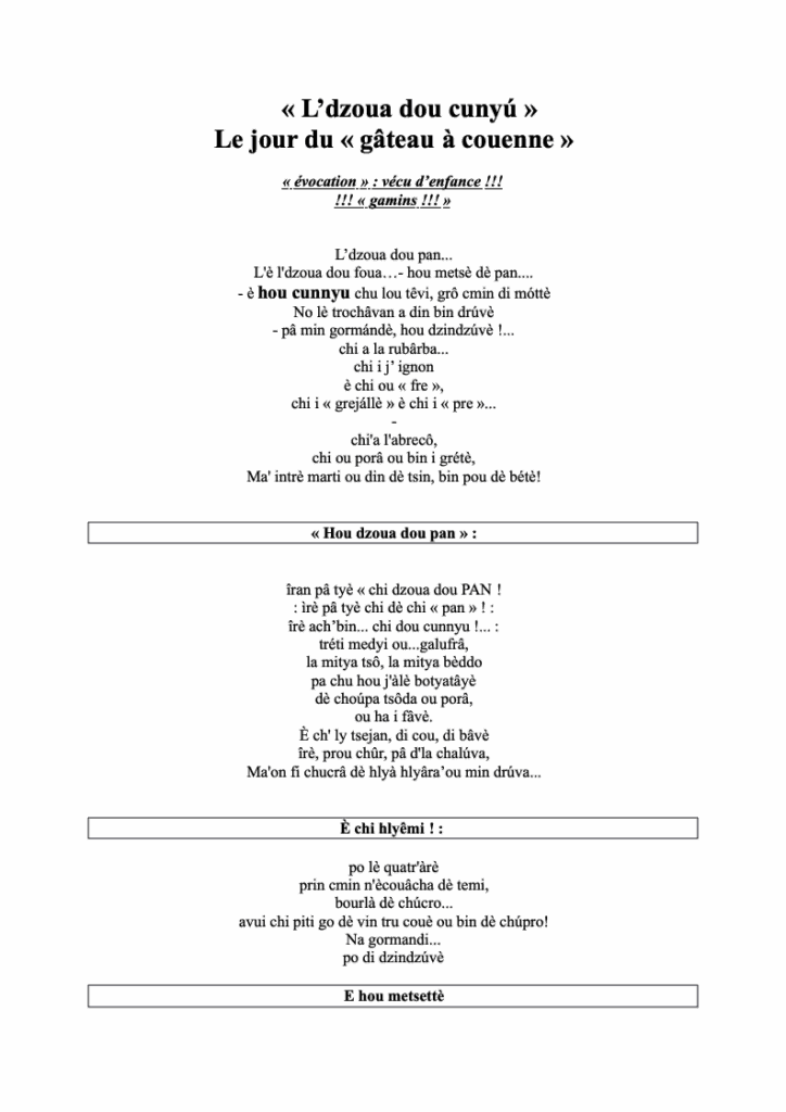 L’i a ouna redâye dè j’an ke, din l’ochkuritâ dè ha tsanbrèta, invrenâ dè la dolà è dè l’inpahyinthe, èpràvo dè yêre chi lêvro. Di j’an è di j’an a atindre chi ke vindrè m’èhyiri po ke chêyo dèlevrâ dè chi malèfitho. Vo m’i chôvâ, adon, po vo rèkonpinchâ, vo bayo chi tsathi. L’è prou gayâ viyo, ma, a la kâva, vo tràvèri inkrotâ chate toupenè inpyâyè dè pithè d’ouâ. Chin cherè vouthron kovin.